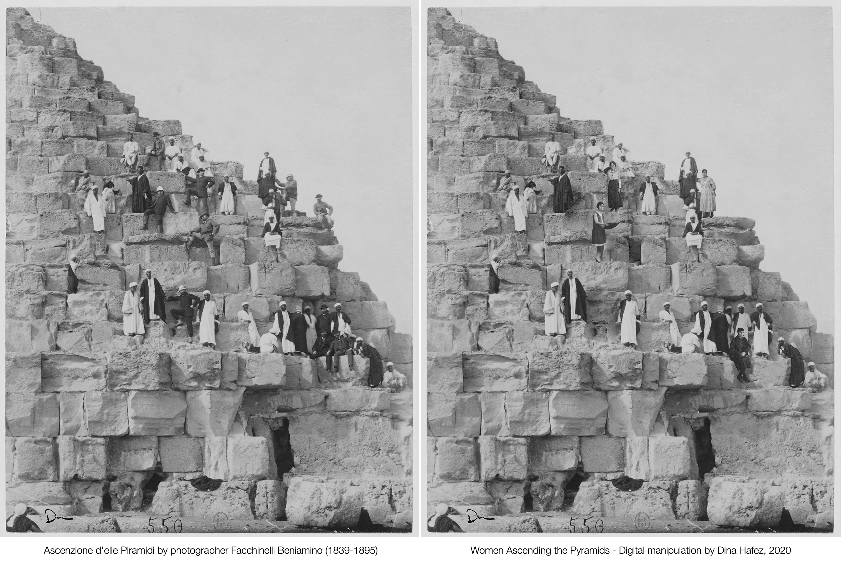 تعمل دينا على تغيير هذا التمثيل بإعادة كتابة تاريخ المواد الأرشيفية الفوتوغرافية التي تمتلكها مصر لتلك الحقبة. وقد عملت دينا على ثلاثة مشاريع مختلفة حتى الآن. أحدث مشروع انتهت منه هو ” نساء يصعدن الهرم”، حيث استبدلت مجموعة من الرجال البيض بنساء مصريات.