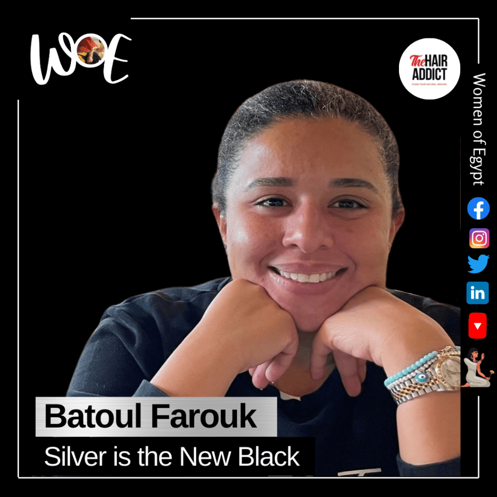 “اكتر حاجه بحبها في الشعر الابيض انه متميز ومخليني مختلفة. اكيد في تعليقات سلبية كتير بأسمعها، خصوصا كمان عشان الشعر الابيض مكانه عندي واضح جدااا، فكنت بواجه جمل زي يا بنتي انتي لسه صغيرة طب ليه؟ طب اصبغيه.