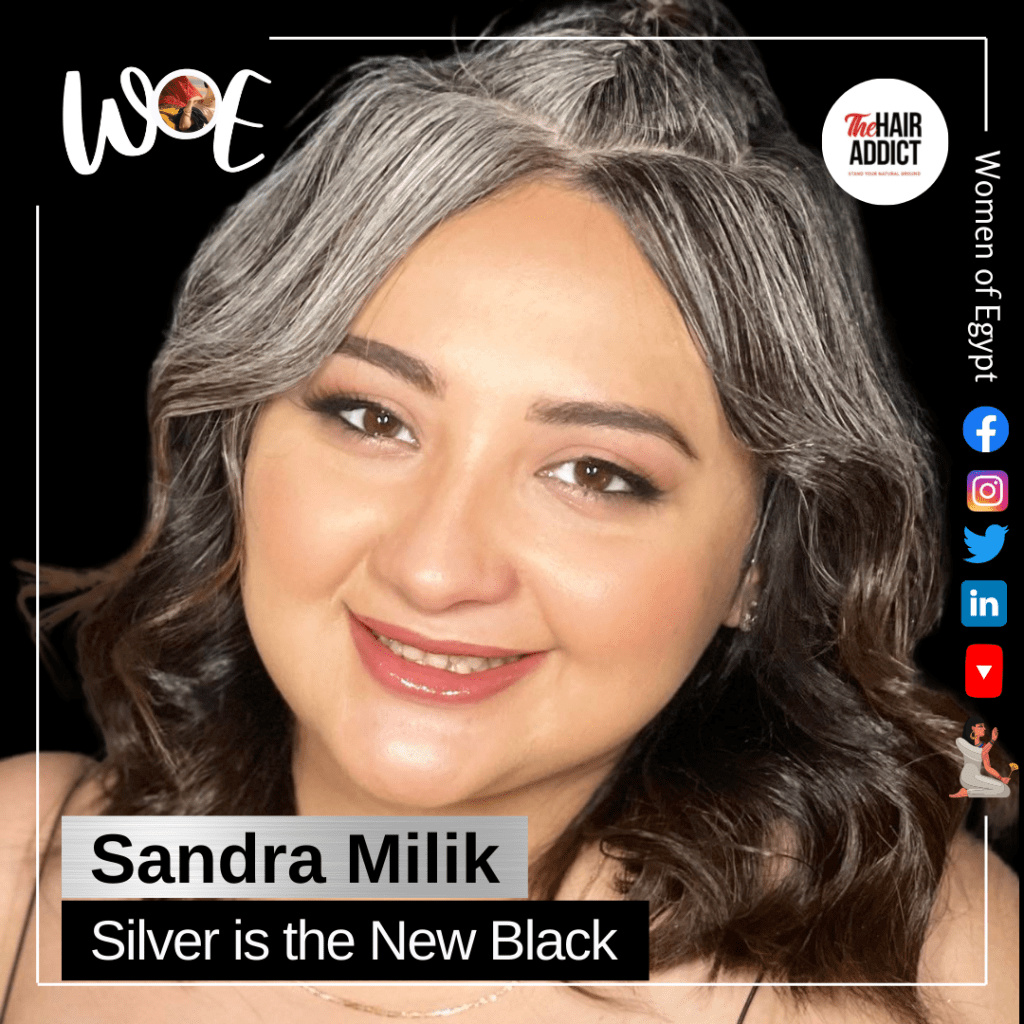 بس مكنش بيفرق معايا عشان حسيت انه مخليني مميزة و مش زي اي حد في سني، لان شعري ابتدي يبيض من وانا عندي ١٦ سنة.” — ساندرا ميليك، ٢٨ سنة، ميك أب أرتيست