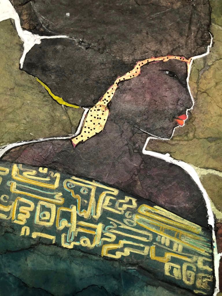 و مما يميز أعمال الفنانة جيهان فايز، التكنيك ‘الجداري’ الخاص بها و الذي طورته عبر سنوات من البحث و التجريب. تعتمد الفنانة علي صباغة أوراق باحبار داكنة و لصقها مع ترك فراغات بينها . هذة الفراغات (تلون بعضها بألوان الإكريليك البيضاء في مرحلة لاحقة ) تعطي لنا شكل و ملمس المجلدات الجلدية أو الكتب العتيقة و قد أصاب سطحها التشقق. و هي كذلك تشبه المباني القديمة التي أصابها التصدع و التأكل مع مرور الزمن. و هذا الملمس تحديداً يضفي علي أعمالها البعد الزمني .و بهذة الطريقة تخلق لنا الفنانة ملمس أو texture غني غير مستوي تلونه بالوانها الزاهية ثم تضيف عناصر زخرفية و متون خاصة بها تكون بمثابة’ التكحيل ‘ للعمل. و كله في تكوين رصين مترابط ، تتحكم فيه الفنانة بعناصرها كمن يقود أوركسترا سيمفوني . و بالرغم من إختلاف التناول و المفهوم، إلا أن المضمون يستدعي مرة أخري المقارنة ببعض أعمال الرائد ماتيس في فترات ركز فيها علي اللون و العناصر الزخرفية في تناول المرأة.