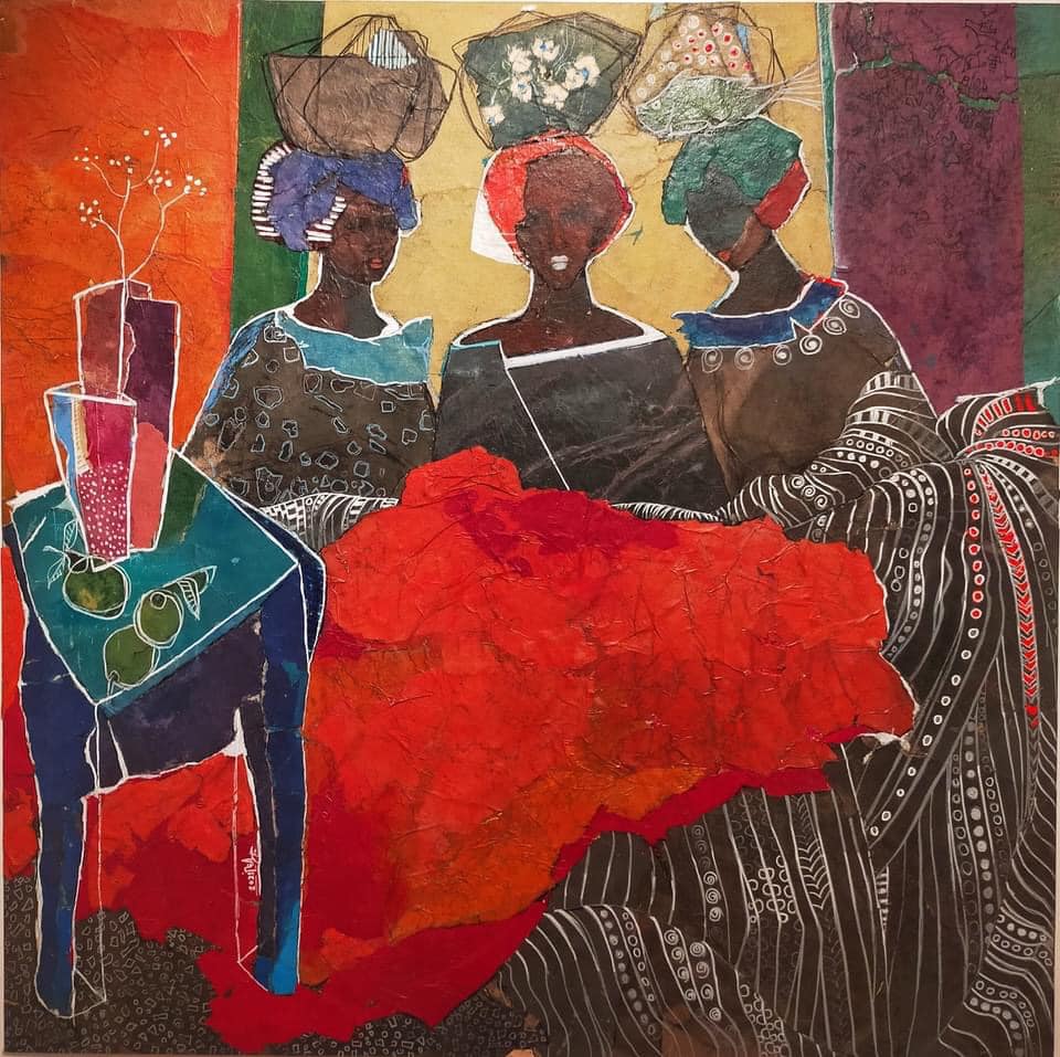 و في معرضها الحالي ‘تكايا’ بقاعة النيل بالزمالك، تتسم أعمال الفنانة جيهان فايز التصورية بمذاق جداري يسترجع عشقها الأول كفنانة جدارية. و لا شك أن أعمالها تذكرنا بالرسوم الجدارية علي الصروح المصرية القديمة، تحمل نكهة تاريخية مفعمة بالأصالة و المعاصرة في نفس الوقت . و بالرغم من الإختزال و التجريد ، تطل علينا شخوصها و قد تشربت من الفن المصري القديم إضافة إلي الصورة التقليدية للمرأة الأفريقية .
